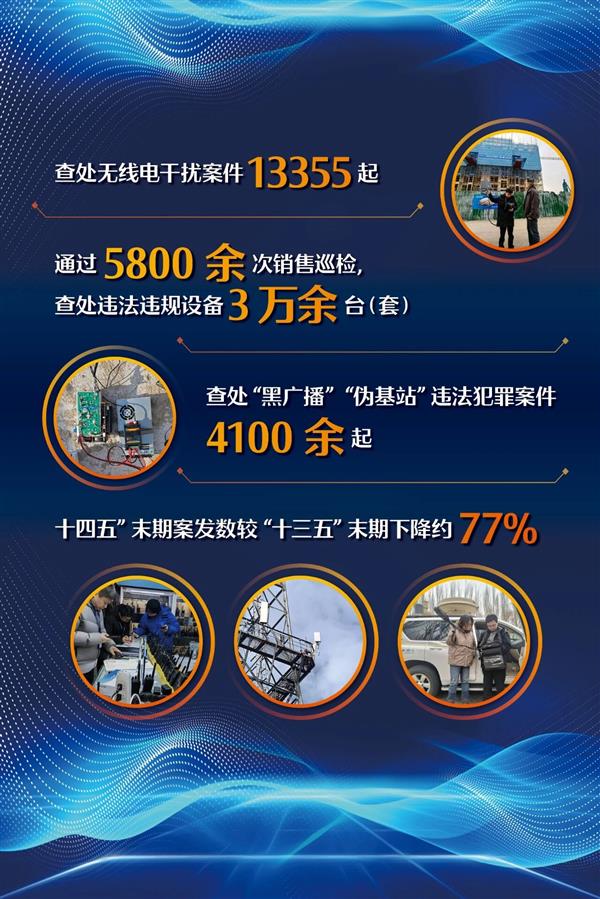 “十四五”时期,我国无线电管理以高压态势打击违法犯罪行为,及时查处非法使用无线电频率和设置、使用无线电台(站)行为,确保各类无线电业务安全运行,切实保障社会安全,维护良好电波秩序,相关工作取得明显成效。