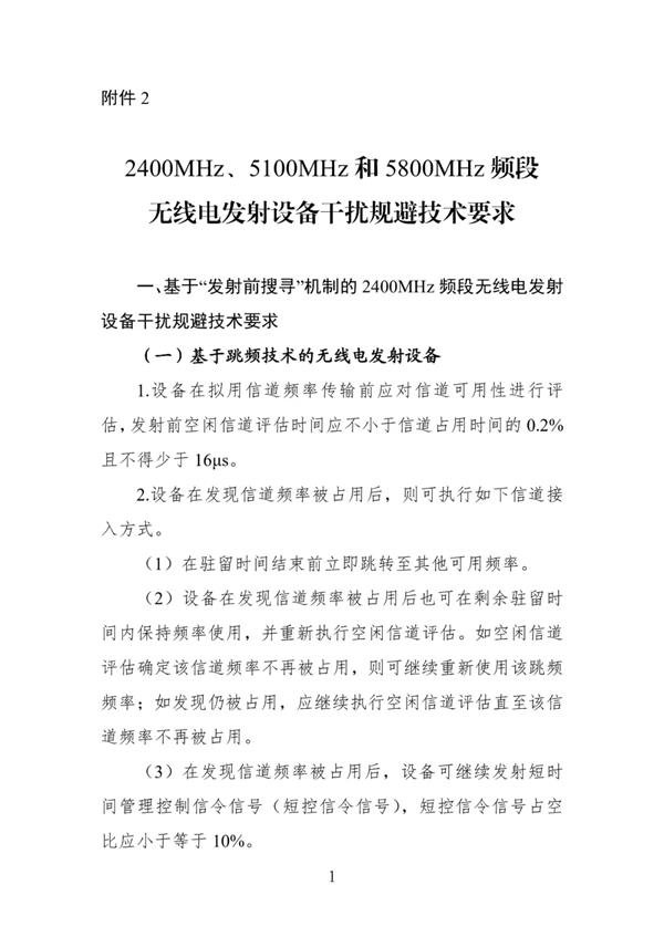 为实现不同无线电业务频率兼容共存,工作在2400MHz、5100MHz和5800MHz频段的无线电发射设备,应符合附件2中所列的干扰规避技术要求之一。