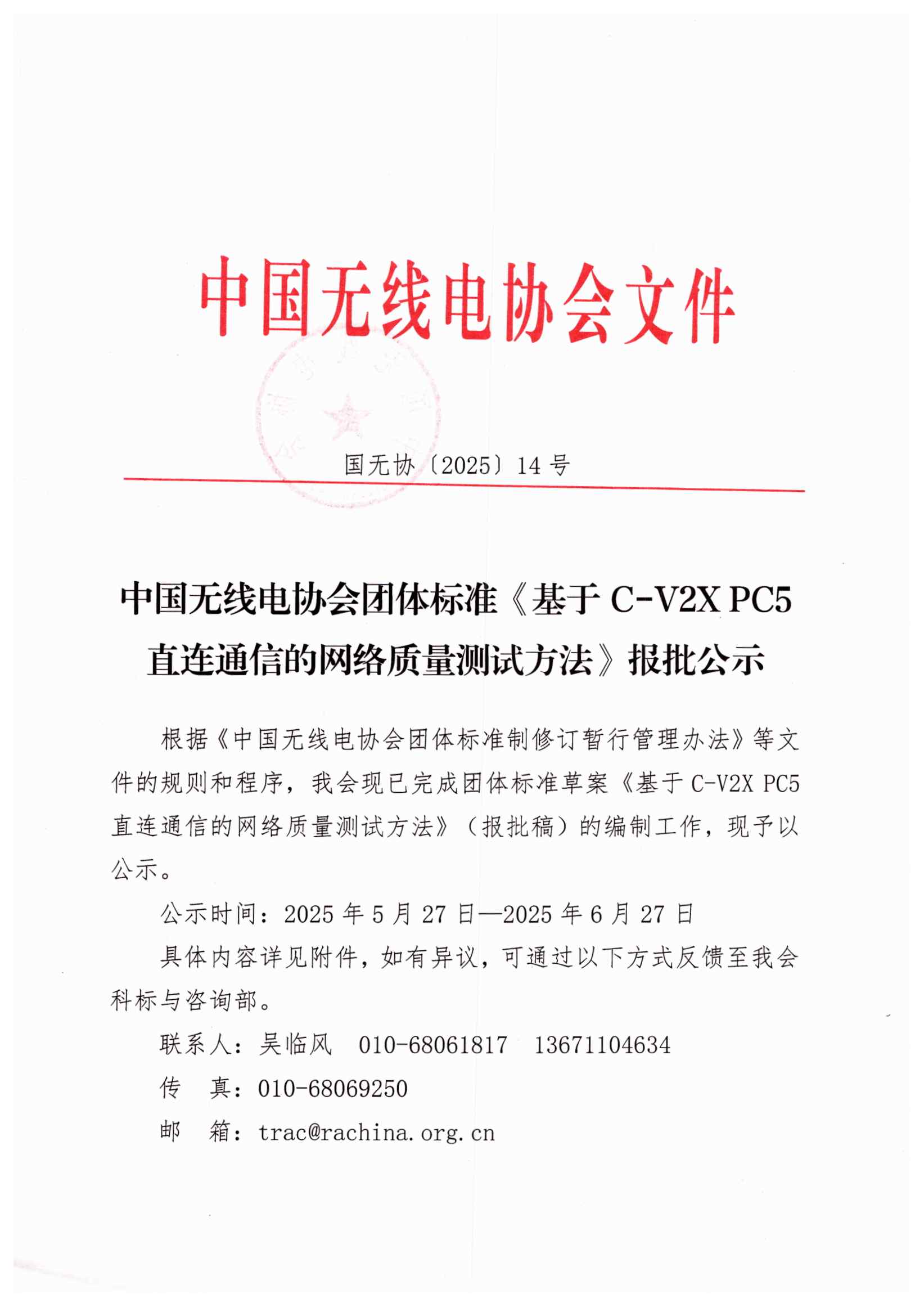 中国无线电协会团体标准《基于C-V2X PC5直连通信的网络质量测试方法》报批公示